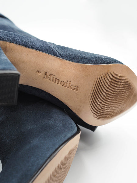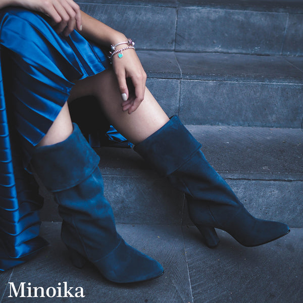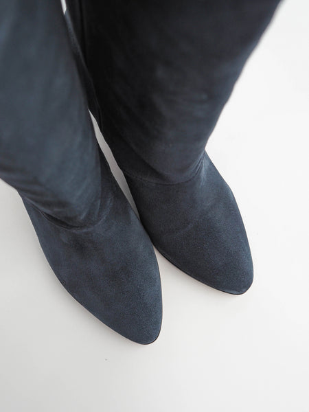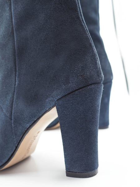 Bota alta piel gamuza azul. Piel vacuno, forro vacuno, suela natural. Producto elaborado a mano en México. 100% Natural. Altura tacón 8cms.