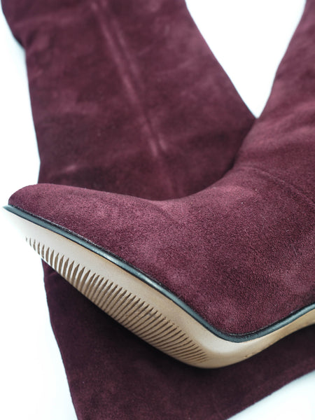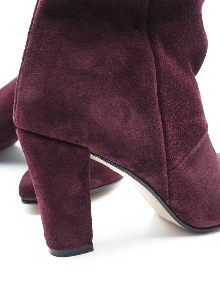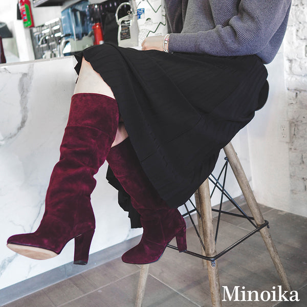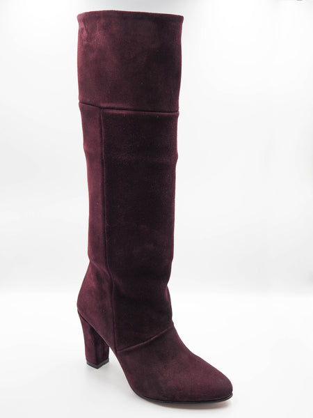 Bota alta piel gamuza vino. Piel vacuno, forro vacuno, suela natural. Producto elaborado a mano en México. 100% Natural. Altura tacón 8cms.